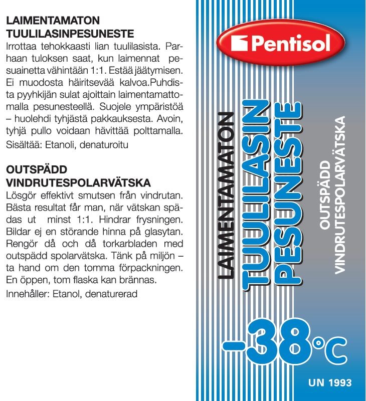 Etanolipohjainen laimentamaton lasinpesuneste irrottaa tehokkaasti lian tuulilasista.Parhaan tuloksen saat kun laimennat pesuainetta vähintään 1:1. Estää jäätymisen.Ei muodosta häiritsevää kalvoa. Parhaan tuloksen saat kun puhdistat pyyhkijän sulatajoittain laimentamattomalla pesunesteellä.