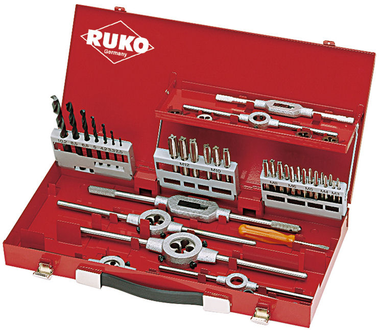 Laadukas saksalaisen Rukon kierretyökalusarja DIN-mittaisilla pakoilla.