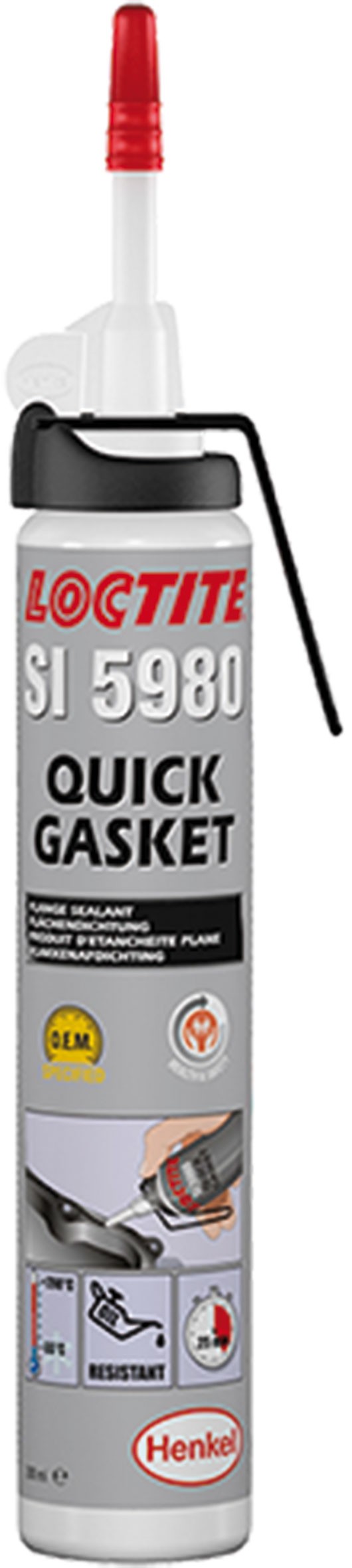 LOCTITE SI 5980 -tasotiiviste, musta, isot välykset, ei merkintöjäTehokas silikonitiiviste, joka kiinnittyy lujasti kaikenlaisiin pintoihin, kuten metallille ja muoville sekä niiden yhdistelmille. Täyttää kaikki korjaus- ja huoltovaatimukset. LOCTITE SI 5980 on suunniteltu erityisesti erinomaista öljynkestävyyttä vaativiin tasotiivistyssovelluksiin.Edut:Kestää erinomaisesti öljyä.Tiivistää kaikenlaiset laipat, kuten metalli- ja muovilaipat sekä niiden yhdistelmät.Korvaa valmiiksi leikatut paperi- tai korkkitiivisteet.Erinomainen joustavuus.Ei syövytä.Hyvä vaihtoehto terveyden ja turvallisuuden kannalta.Käyttövalmis.Tekniset tiedot:Väri: mustaKosketuskuivuusaika: 30 min.Vetolujuus: 1,6 N/mm²Työskentelylämpötila: -55 °C – +250 °C