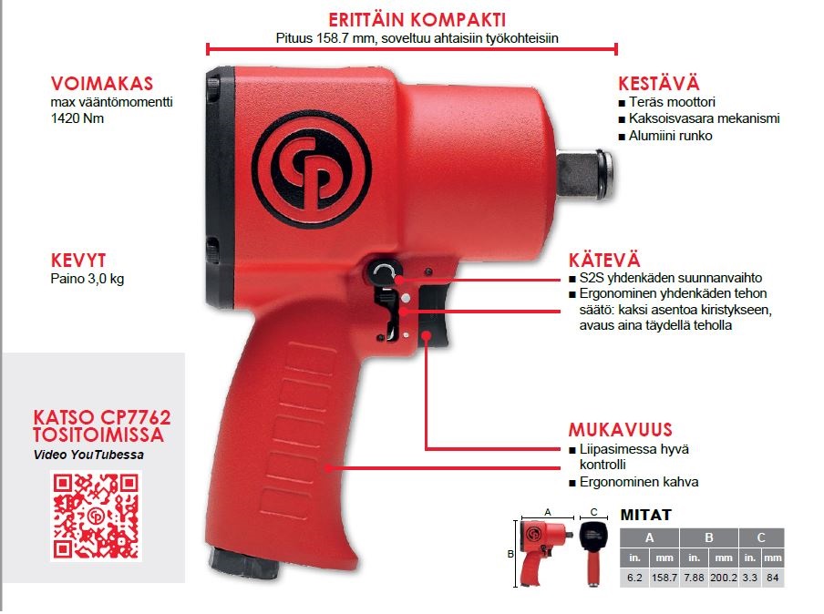 Erittäin kompakti 3/4″ mutterinväännin. Kaksoisvasara iskumekanismi. Vapaa nopeus 4850 rpm/min.Max. vääntömomentti 1420 Nm. Paino 3 kg. Ilmankulutus 16.4 l/s.