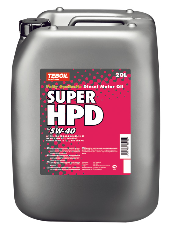 Täyssynteettinen. Teboilin Super HPD-sarjan öljyt ovat useiden eurooppalaisten ja amerikkalaisten Euro 1-4 -dieselmoottoreiden ykkösvaihtoehto. Ominaista Super HPD:n tasoista öljyä käyttäville moottoreille ovat korkeat ominaistehot ja pitkät huoltovälit. Se antaa vahvan suojan sylinteriputkien kiillottumista ja karstan muodostumista vastaan myös vanhemmille dieselmoottoreille.Suorituskyky: API CI-4, CH-4, CG-4, CF-4; ACEA E7, E5, B3, B4; MB 228.3; MAN 3275; Volvo VDS-3, VDS-2; CAT ECF-2, -1a; Global DHD-1; Renault RVI RLD; Jaso DH-1; MTU 2; Cummins CES 20071, -2, -6, -7, -8Varastossa koko 20L.
